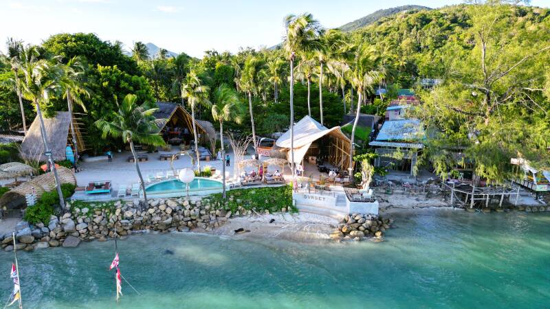 How about sundowners at a Beach Club instead? Welcome to Harmony Beach Club. They have all the same views and swimming as the beach, but with a pool, plus cocktails and a DJ. We had a waterfront couch right next to the infinity pool, which had views across the Gulf to Ko Samui. It has its own skate park, dance hut with DJ booth, restaurant, and very attentive staff to keep your drinks flowing as the sun goes down.